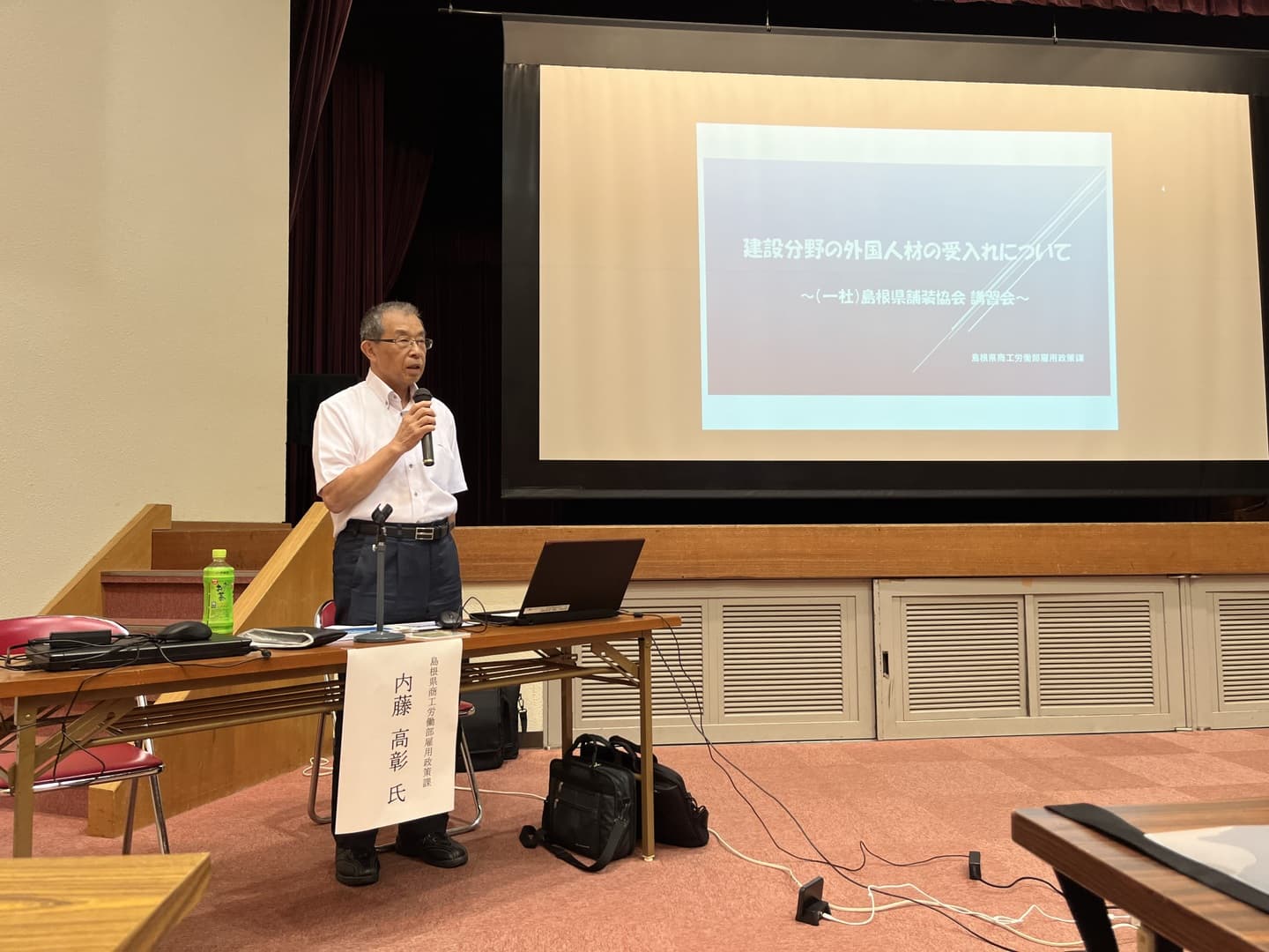 島根県商工労働部雇用政策課から外国人材雇用情報提供窓口専門員 内藤高彰 様をお招きし「外国人材雇用制度」 を受講し、続いて会員2社(ヒカワ工業株式会社、日発工業株式会社)の各担当者から、外国人材雇用状況及び実状について事例発表がありました。