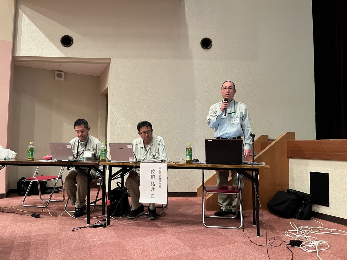 島根県土木部道路建設 課長補佐 村上威臣氏及び道路維持課 道路維持係 主任 小林由加里氏、同主任 松浦雅大氏をお招きし「しまねの道づくりについて」 を受講し、続いて、前田道路株式会社中国支社 技術部副部長 佐伯祐介氏による、「舗装業界のカーボンニュートラルの取組(中温化技術)」及び「舗装の調査・診断(舗装診断士)」を受講しました。