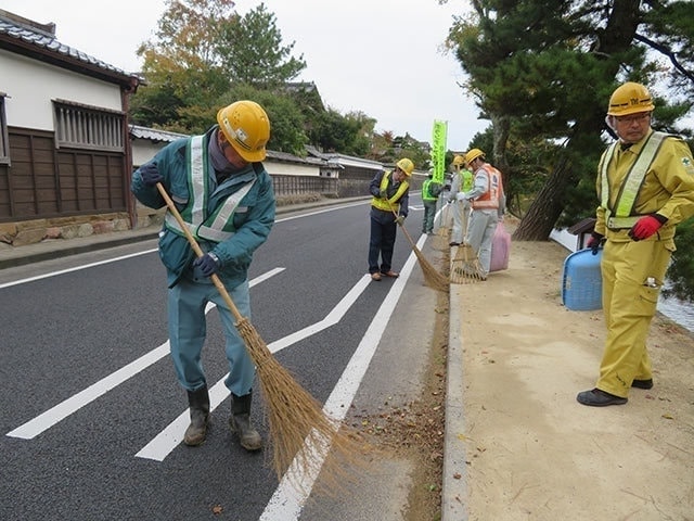 マラソンコースとなる中海沿いの道路では草刈り、塩見縄手周辺では落ち葉拾いに汗を流し、トラック3台分の雑草・落ち葉を集めました。