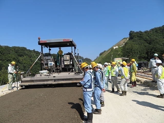午後からは、朝山大田道路の朝倉地区舗装工事現場において、現地研修を行いました。
